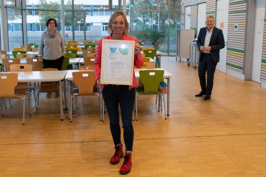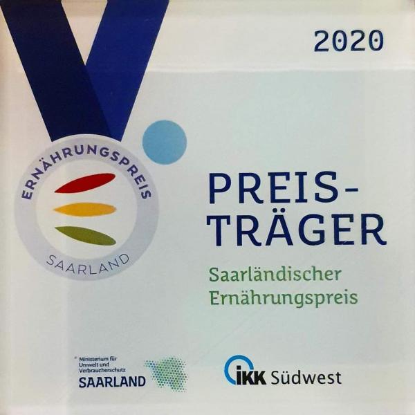 Saarländischer Ernährungspreis 2020Die Sophie-Scholl-Gemeinschaftsschule in Dillingen wurde wegen ihres ganzheitlichen Konzeptes mit dem IKK-Südwest-Innovationspreis im Rahmen des Saarländischen Ernährungspreises 2020 ausgezeichnet. Ausschlaggebend dafür war das schlüssige Gesamtkonzept: frische Zutaten mit dem Fokus auf die Region "Ebbes von Hei", das soziale Ritual des gemeinsamen "Erlebnis" Mittagessen aber auch, das Schülerinnen und Schüler mit klugen Ideen lernen, Lebensmittel wertzuschätzen und auf Verschwendung zu achten. Landrat Patrik Lauer lies es sich deshalb nicht nehmen, Stephanie Veith vom Partyservice Schwed Natürlich Kochkunst GmbH und der Ganztagskoordinatorin Anne Wilhelm zum Ernährungspresi 2020 zu gratulieren. |